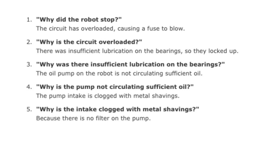 Toyota is the god father of lean manufacturing, for problem solving on the production line they introduced the five why’s. For example: