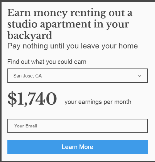 Rent the backyard is trying to solve this very real problem, people living in San Francisco (at the moment) can get ‘Rent the backyard’ to build a studio apartment in their backyard, then market it for you & split the profits.