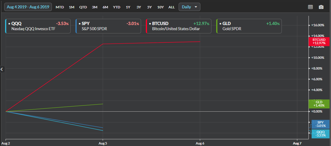 Some people are calling Bitcoin the new safe haven asset, yesterday among all the market turmoil managed double digit gains as you can see in the chart below.