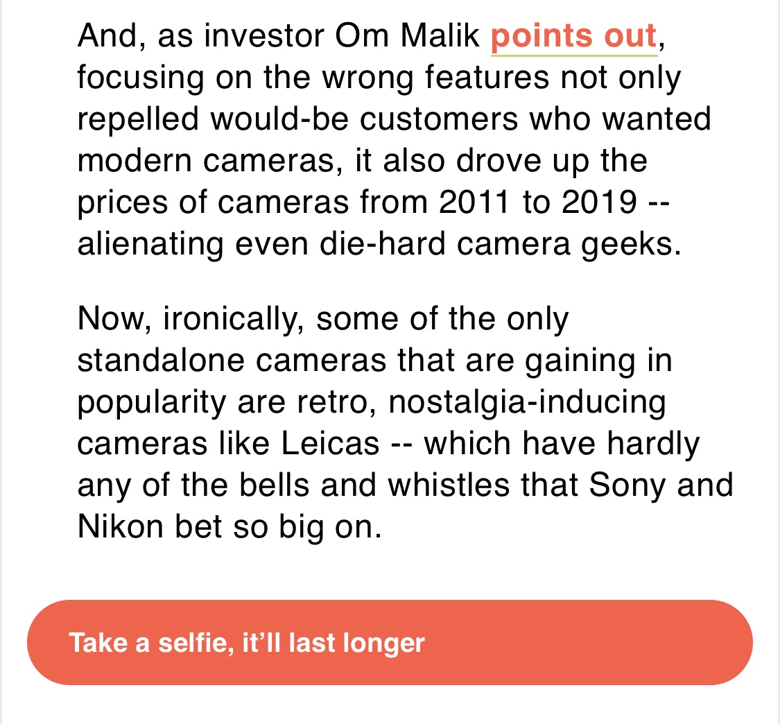 Cameras Post navigation Previous post: Mobile extremesNext post: Sunday paddle Posted September 7, 2019 by PeteStilgoe Following on from yesterday’s post, email I got this morning about the rapidly declining camera market. The Hustle Uncategorized Share this: Share on X (Opens in new window) X Share on Facebook (Opens in new window) Facebook Share on LinkedIn (Opens in new window) LinkedIn Email a link to a friend (Opens in new window) Email Like Loading... Related PeteStilgoe View All →