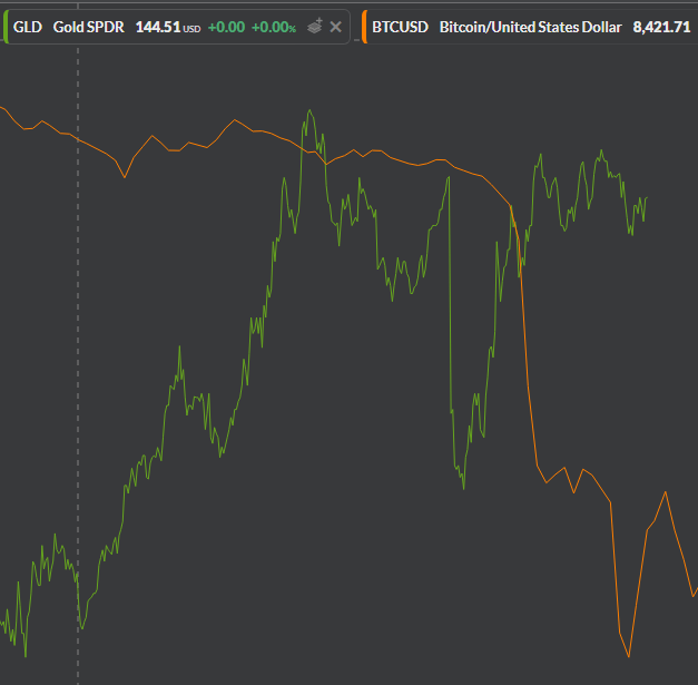 Yesterday the so called digital gold (bitcoin), had a very different day to the major gold ETF, as you can see in the chart below: