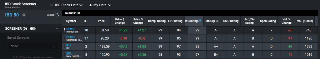 In the above image I have it open with the IBD 50 stocks, you can filter & screen on the various IBD ratings as you would expect, going by its name.