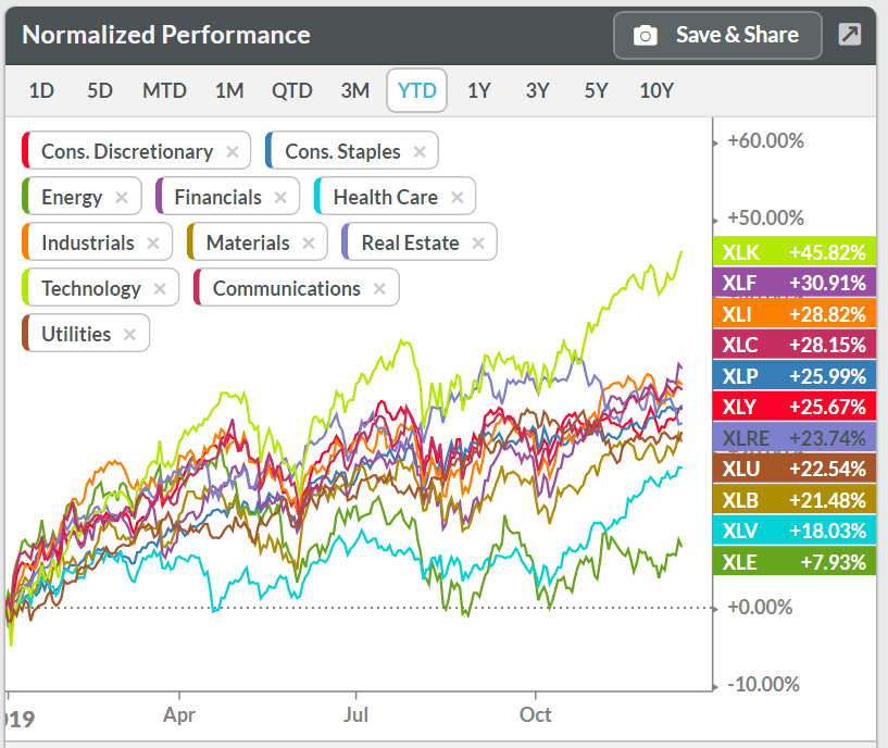 US stock markets are at all time highs, just buying the indexes this year would have yielded a very nice return, which you can see reflected in the performance of the major US sectors.