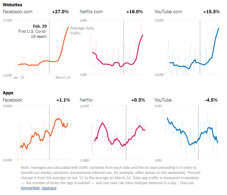But a New York Times analysis of internet usage in the United States from SimilarWeb and Apptopia, two online data providers, reveals that our behaviors shifted, sometimes starkly, as the virus spread and pushed us to our devices for work, play and connecting.”