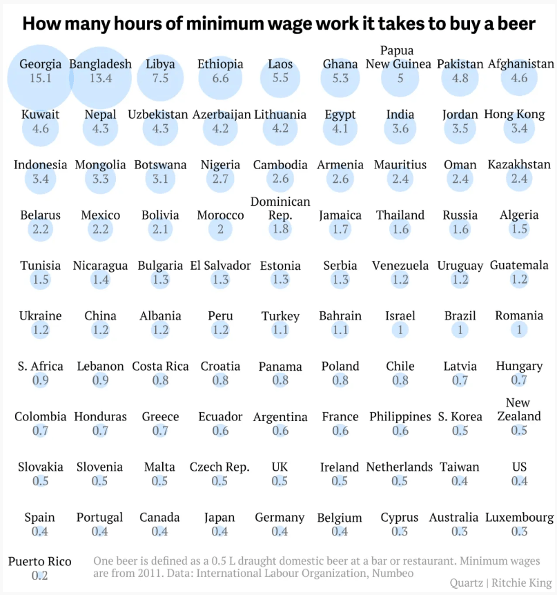 Increased about 40% in the UK to 0.7 hours work to buy a pint based on the above numbers.
