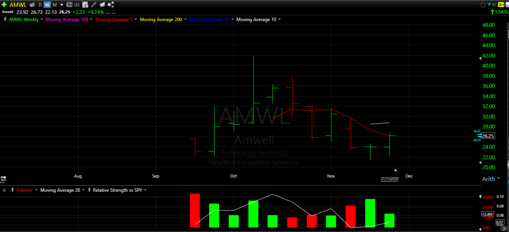 $AMWL Post navigation Previous post: Dope highsNext post: Festive face masks Posted November 29, 2020 by PeteStilgoe Check the volume profile on this IPO stock Amwell. Under accumulation. Double bottom. Next weeks watchlist. Uncategorized Share this: Click to share on X (Opens in new window) X Click to share on Facebook (Opens in new window) Facebook Click to share on LinkedIn (Opens in new window) LinkedIn Click to email a link to a friend (Opens in new window) Email Like Loading... Related PeteStilgoe View All →