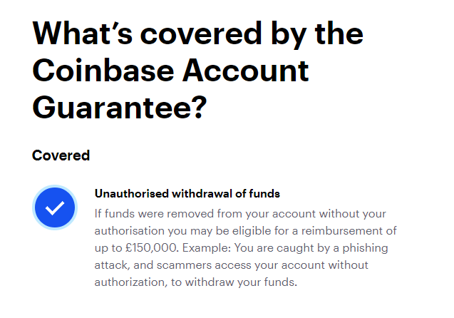 We’re introducing a new pilot for UK customers: The Coinbase Account Guarantee. Should someone gain unauthorised access to your Coinbase account and misappropriate funds, you may now be eligible for a reimbursement of up to £150,000.”