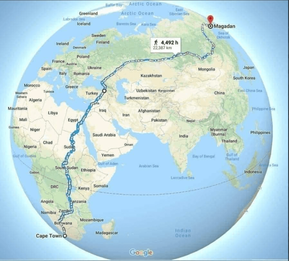 “The longest road in the world to walk, is from Cape Town (South Africa) to Magadan (Russia). No need for planes or boats, there are bridges. It’s 22.387 miles and it takes 4.492 hours to travel. It would be 187 days walking nonstop, or 561 days walking 8 hours a day.”