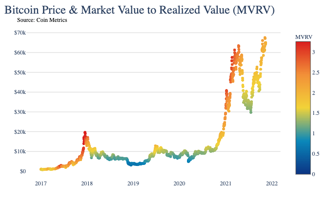 “Even though BTC is breaking new all-time highs, its free float market value to realized value (MVRV) ratio is currently relatively low. Market value to realized value (MVRV) has historically been one of the most reliable on-chain indicators of bitcoin market tops and bottoms. During previous cycles a free float MVRV of 3.0 or above has indicated a local top, while an MVRV of below 1.0 has indicated the bottom of the cycle. Free float MVRV is currently about 2.1. For more information about MVRV and an in-depth explanation of how it’s calculated check out our On-Chain Indicators Primer.”