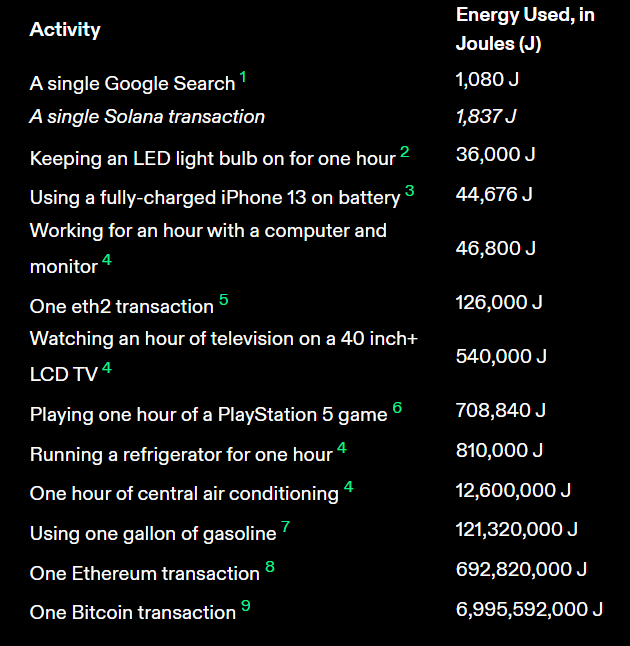 “The Solana network is designed to be a high-performance blockchain. These design decisions also mean the network is incredibly energy efficient. In this first of many reviews of the impact of the Solana ecosystem, the Solana Foundation can report that a transaction on Solana takes less energy than two Google searches, and 24 times less energy than charging your phone.”