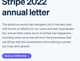 Stripe 2022 Great read. Small increments. https://stripe.com/gb/annual-updates/2022? Read more Stripe 2022